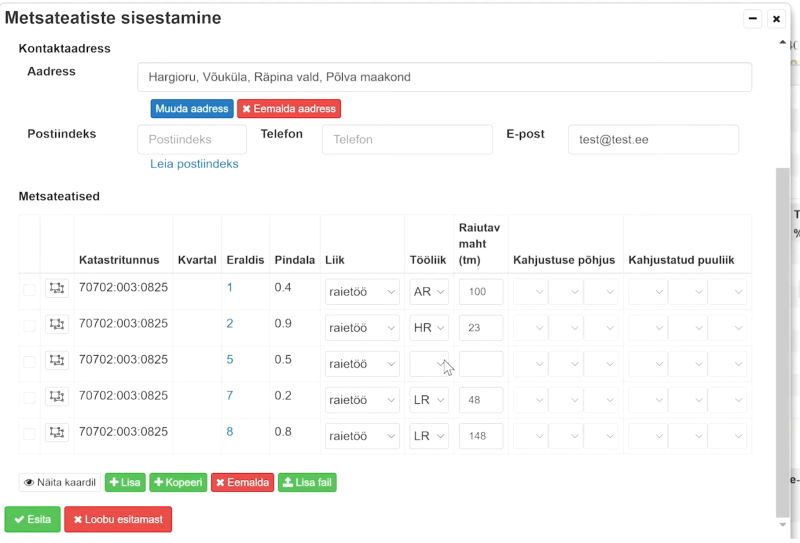 - Liik – raietöö liik (raietöö, metsakahjustus vms)